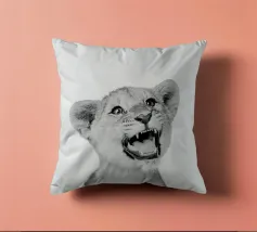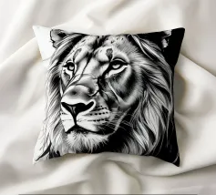Il ritratto di un leone mostra grandi occhi espressivi e una corona floreale in bianco e nero. La morbida pelliccia è perfettamente enfatizzata in un'illustrazione fotografica minimalista e cattura lo straordinario fascino della natura. Ideale per gli amanti degli animali.