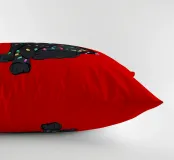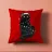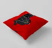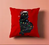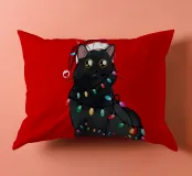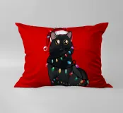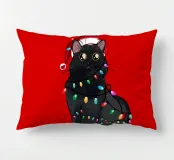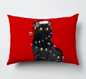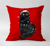 Adorabile gatto nero impigliato in luci natalizie colorate: un'illustrazione festiva e divertente per gli amanti dei gatti e dell'arredamento accogliente.