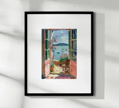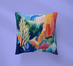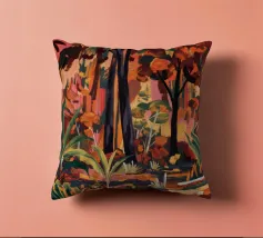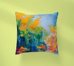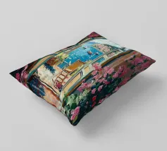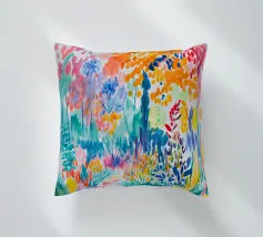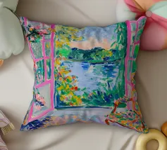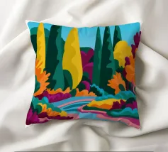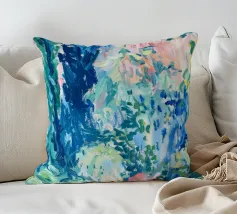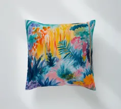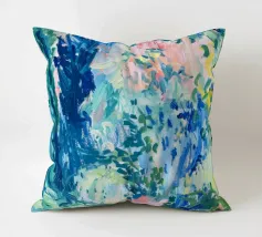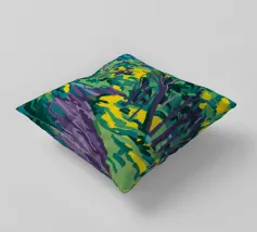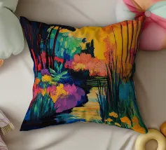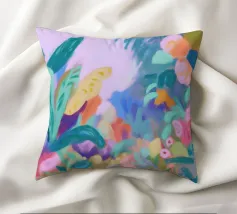 Un sentiero che attraversa un giardino all'inglese, circondato da una vegetazione vivace e da fiori sbocciati nei toni del rosa, del viola, del blu, del giallo e del verde acqua, dipinti con audaci pennellate di pittura acrilica, creando una scena vibrante e colorata che ricorda lo stile di Matisse. I colori sono brillanti e saturi e aggiungono profondità alla composizione, mentre le ombre morbide aggiungono dimensione a elementi come alberi, fogliame, cespugli e rocce. Questo dipinto evoca gioia e giocosità, creando un effetto allegro.