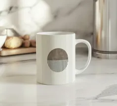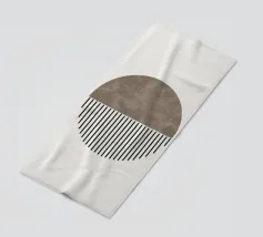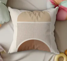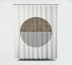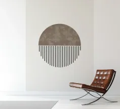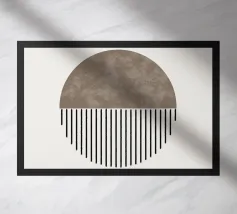 Opera d'arte geometrica minimalista con linee nere e un semicerchio di colore marrone con texture, su uno sfondo beige neutro e morbido.