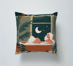 Raffigura un paesaggio tranquillo con uno specchio d'acqua in primo piano. Erbe alte e canne costeggiano l'acqua. Al centro, alberi dal tronco rosato e dal fogliame verde. Lo sfondo è caratterizzato da colline ondulate nei toni dell'arancione, del giallo e del verde, con un cielo blu e nuvole bianche in alto.