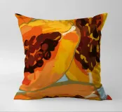 Un'illustrazione lussuosa, dettagliata e ravvicinata di una papaya tagliata a fette, che si concentra sulla sua polpa arancione vibrante e sui semi neri scintillanti. L'opera è una celebrazione ricca e sensuale del frutto tropicale.