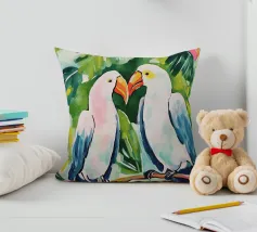 Due pappagallini si accoccolano l'uno all'altro su un'amaca in mezzo al verde. Le loro teste sono leggermente inclinate, come se sussurrassero segretamente che, dopo tutto, questo è davvero il posto migliore del mondo. Perfetto per chiunque voglia portare un po' di allegria e amore nella propria casa.