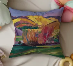 Un pittoresco paesaggio autunnale che raffigura un villaggio o una fattoria adagiata su una collina, circondata da un mosaico di alberi colorati nei toni dell'arancione e del giallo e da campi coltivati, con le lontane montagne blu a completare la scena.