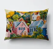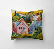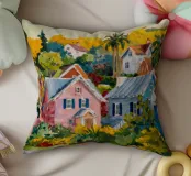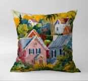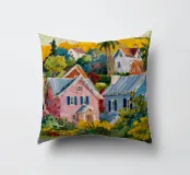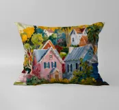 Un villaggio di case colorate di rosa, blu e giallo è adagiato sul fianco di una collina; la scena è composta come un'allegra trapunta patchwork di colori e forme, che emana un senso di comunità e gioia.