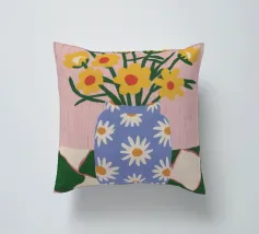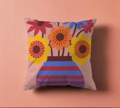 Un vaso a righe bianche e blu contiene fiori gialli e rosa, su uno sfondo vibrante, simile a una trapunta, con motivi floreali rosa, arancioni e rossi.