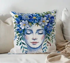 Delicato ritratto di profilo di una donna dalla pelle chiara e dai capelli chiari ornati di fiori blu, che indossa un abito blu strutturato che fa pensare a piume o a un tessuto morbido.
