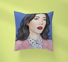 Una donna senza volto con rossetto rosso e capelli neri sciolti posa con sicurezza su un rosa tenue.