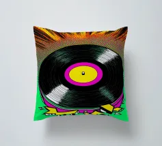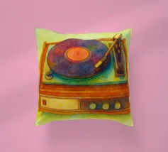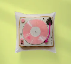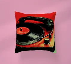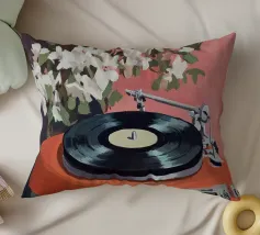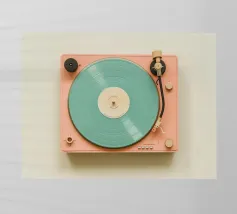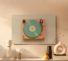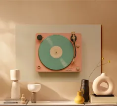 Questa immagine mostra un giradischi in stile vintage dal design chiaro e minimalista. Il giradischi è prevalentemente color pesca con una finitura opaca e un disco verde chiaro sul piatto. Il braccio, che si trova sul lato destro, è anch'esso color pesca con accenti beige e un cavo nero che lo affianca. Lo sfondo è di un colore neutro bianco sporco che si integra con i toni pastello del giradischi. L'estetica complessiva è moderna, con un tocco retrò.