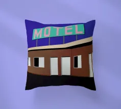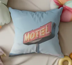 Una classica insegna retrò "MOTEL" risplende contro un cielo serale blu intenso, affiancata da palme in primo piano. L'immagine cattura un'atmosfera nostalgica e cinematografica che ricorda un classico viaggio americano in macchina.