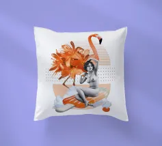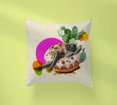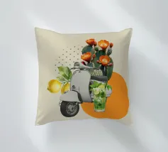 Un collage giocoso e retrò che fonde l'estetica vintage con la cultura pop: una ragazza degli anni '60 in bianco e nero con occhiali tondi e sciarpa si trova di fronte a un cactus mediterraneo, un cono gigante di patatine fritte, una Vespa nera e una ciambella rosa con zuccherini colorati. La composizione è arricchita da audaci cerchi di colore in stile grafico. Perfetta per gli spazi creativi, le cucine moderne o gli interni degli amanti della pop art.