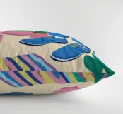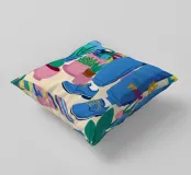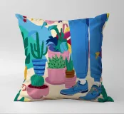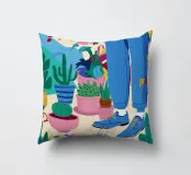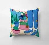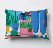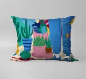 Un'illustrazione di una stanza vivace e in stile bohémien è assolutamente piena di una collezione di piante in vaso e cactus su un tappeto a righe colorate, creando un rifugio perfetto per un amante delle piante.