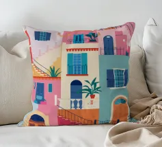 Una ripida scalinata colorata funge da strada in una città mediterranea, fiancheggiata da edifici di colore giallo, arancione e rosa, ornati da piante verdi in vaso.