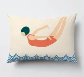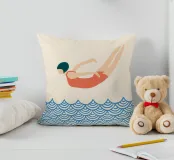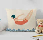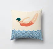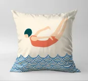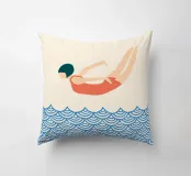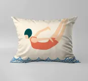 Questa immagine artistica mostra una donna stilizzata in costume da bagno rosso che si tuffa elegantemente in mare: un simbolo di libertà, leggerezza e sensazione estiva. Le forme chiare, le onde blu e i tenui colori pastello conferiscono al motivo un fascino moderno e retrò in stile metà secolo. Perfetto per gli amanti dell'arte minimalista, dell'estetica vintage e dei momenti estivi mediterranei.