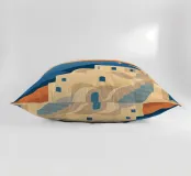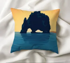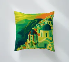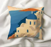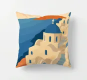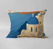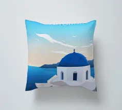Design di viaggio minimalista della Grecia con le famose case bianche dell'isola greca di Santorini, le rocce vulcaniche e il blu del Mar Mediterraneo. Tipiche case graziose come nei villaggi di Oia e Fira.