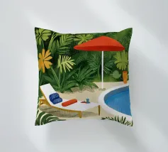 L'immagine mostra un idilliaco paesaggio costiero con case imbiancate a calce, porte e finestre blu e tetti color arancio, che si adagiano come terrazze su una scogliera rocciosa. Sullo sfondo svetta un mulino a vento, mentre il mare blu intenso luccica sotto un cielo limpido. Una vegetazione rigogliosa e fiori colorati costeggiano i sentieri. Lo stile è pittoresco e romantico, ispirato all'architettura mediterranea - in particolare all'isola greca di Santorini - e trasmette tranquillità, calore e bellezza senza tempo.