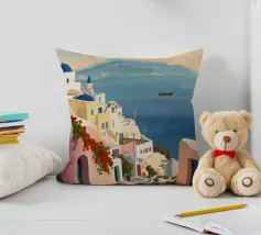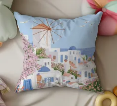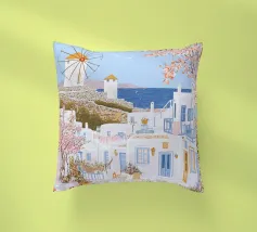 L'immagine mostra un idilliaco paesaggio costiero con case imbiancate a calce, porte e finestre blu e tetti color arancio, che si adagiano come terrazze su una scogliera rocciosa. Sullo sfondo svetta un mulino a vento, mentre il mare blu intenso luccica sotto un cielo limpido. Una vegetazione rigogliosa e fiori colorati costeggiano i sentieri. Lo stile è pittoresco e romantico, ispirato all'architettura mediterranea - in particolare all'isola greca di Santorini - e trasmette tranquillità, calore e bellezza senza tempo.