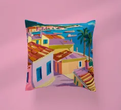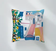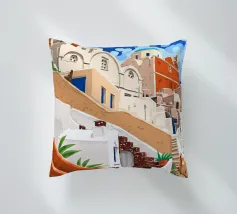 La scena pittoresca di un villaggio bianco di Santorini, con la sua classica chiesa a cupola blu, è ravvivata da fiori di bouganville rosa vibrante che si arrampicano sui muri.