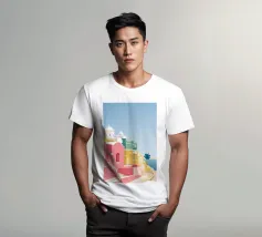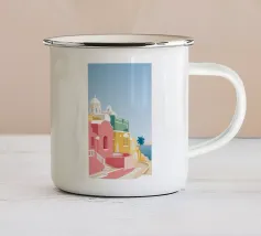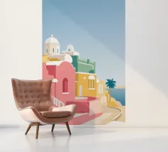 Una pittoresca illustrazione degli iconici edifici bianchi e delle cupole blu di un'isola greca, probabilmente Santorini, affacciata sul mare. La scena è una perfetta rappresentazione, inondata di sole, di un paradiso mediterraneo.