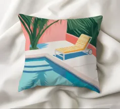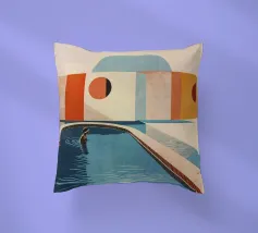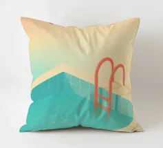 Poster raffigurante una piscina estiva con una scala arancione e riflessi d'acqua stilizzati. Un gioco di ombre, luci grafiche e una tavolozza solare. Perfetto per un look vintage e rinfrescante.
