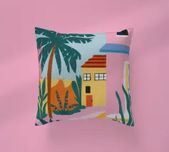 Scale rosse e vivaci conducono verso l'alto passando davanti a una finestra che rivela un cielo soleggiato, una palma e un sole splendente, a simboleggiare un viaggio verso una destinazione gioiosa.
