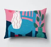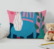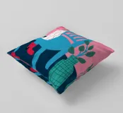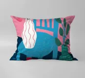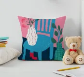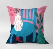 Un'affascinante ed eccentrica natura morta con una pianta in vaso appoggiata su una sedia blu brillante. La composizione è semplice ma piena di carattere, con colori vivaci e uno stile giocoso.