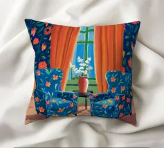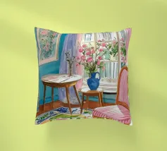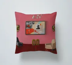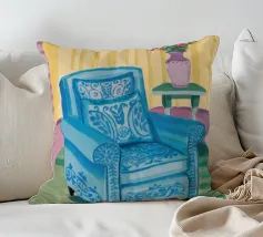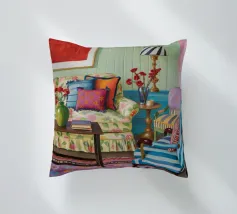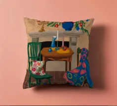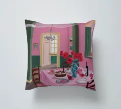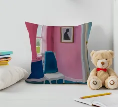Una scena d'interni con una poltrona vuota rivestita con un motivo chintz floreale, riflessa in un grande specchio. La stanza è dipinta nei toni del rosa e del rosso, creando un'atmosfera calda, accogliente e leggermente nostalgica.