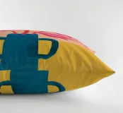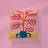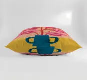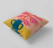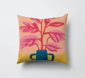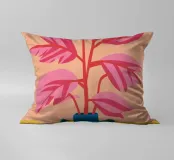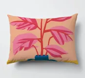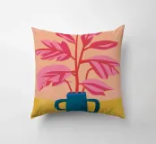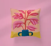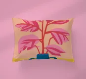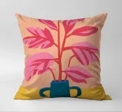 Un'illustrazione semplice ma d'effetto di una pianta dalle foglie rosa in un audace vaso blu su uno sfondo caldo, che celebra la bellezza del colore e della forma botanica minimalista.