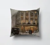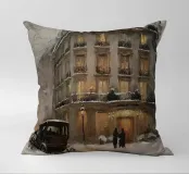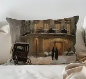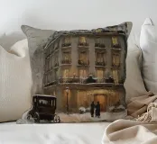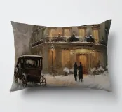 Un romantico paesaggio urbano dal sapore invernale: una carrozza nera trainata da cavalli si ferma nella neve fresca davanti a un magnifico edificio antico con finestre illuminate in modo caldo. Due persone elegantemente vestite sono impegnate in una conversazione, mentre i lampioni gettano una luce dorata sulla strada innevata. La scena racconta di un'epoca passata, dell'eleganza e della tranquilla bellezza di una serata innevata in città.
