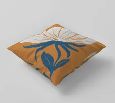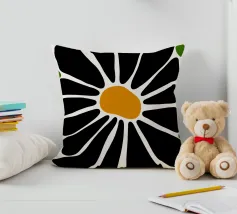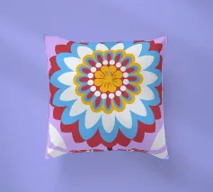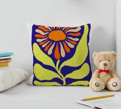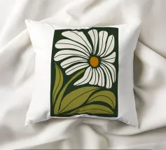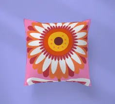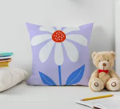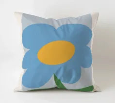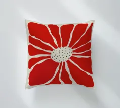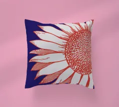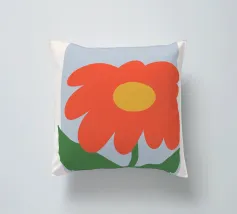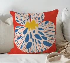 Un'illustrazione audace e grafica di un singolo grande fiore, probabilmente un anemone, con petali a strisce bianche e blu e un centro giallo. Lo sfondo rosso brillante rende il fiore il fulcro assoluto di questo pezzo potente.