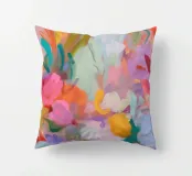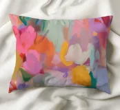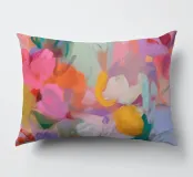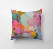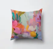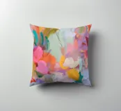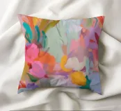 Il motivo mostra una vivace composizione floreale astratta, piena di energia e movimento. Pennellate dinamiche di rosa, arancio e verde si fondono con colori pastello tenui per creare un'arte floreale moderna. La pittura conferisce all'opera profondità e leggerezza estiva.
