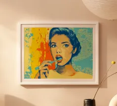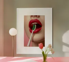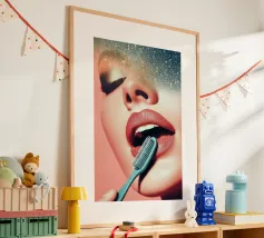 Un'esplosione di freschezza retrò con questa vibrante illustrazione pop art! Caratterizzato da labbra in grassetto, un classico spazzolino da denti pieno di pasta alla menta e un energico sfondo a strisce, questo pezzo irradia una sensazione di frizzante freschezza e di sicura igiene orale. È un'elegante strizzata d'occhio alla pubblicità vintage con un messaggio senza tempo di igiene pulita!