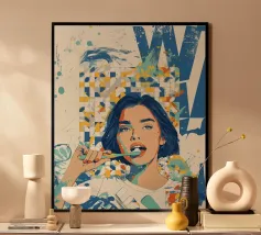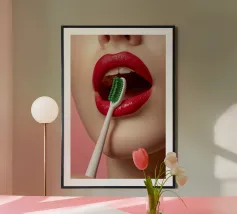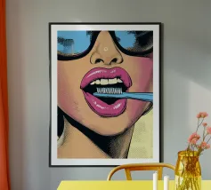 Un'esplosione di freschezza retrò con questa vibrante illustrazione pop art! Caratterizzato da labbra in grassetto, un classico spazzolino da denti pieno di pasta alla menta e un energico sfondo a strisce, questo pezzo irradia una sensazione di frizzante freschezza e di sicura igiene orale. È un'elegante strizzata d'occhio alla pubblicità vintage con un messaggio senza tempo di igiene pulita!
