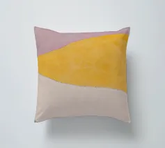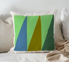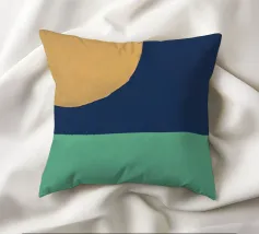 Domina uno stile minimalista con ampie fasce di colore blu, verde e viola, separate da linee rette per creare una composizione segmentata. L'elemento centrale ricorda un paesaggio stilizzato con un primo piano, un orizzonte e un cielo semplificati.