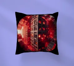Una surreale visione fisheye di strutture urbane torreggianti con dettagli intricati e modelli simmetrici, che convergono verso un cielo radioso. Il design architettonico stratificato evidenzia l'innovazione moderna e la creatività artistica.