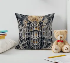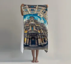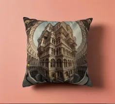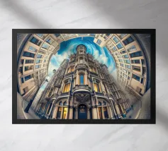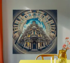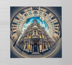 Un ipnotico edificio in stile vittoriano è circondato da un paesaggio urbano circolare. Le finestre illuminate contrastano con il vorticoso cielo notturno stellato, creando un'atmosfera incantevole e surreale. Gli intricati dettagli architettonici aggiungono eleganza e mistero.