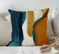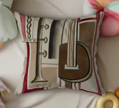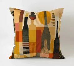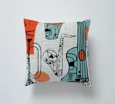 Un moderno dipinto astratto con forme geometriche che formano chitarre, violini e note musicali in una composizione audace e colorata. Lo sfondo strutturato e la disposizione dinamica evocano un senso di ritmo e di espressione artistica.