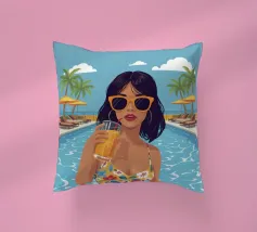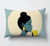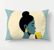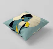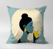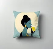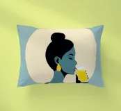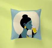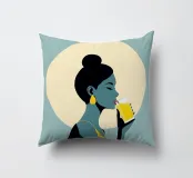 Un'illustrazione audace ed elegante di una donna che sorseggia una bevanda fresca sotto l'alone luminoso del sole. La tavolozza di colori retrò, verde acqua e oro, dona calore, energia e personalità a qualsiasi ambiente. Ideale per cucine, caffè, bar e spazi moderni e luminosi.