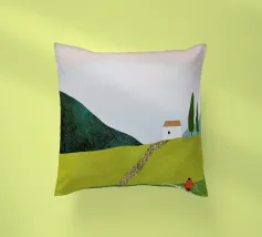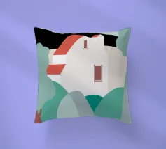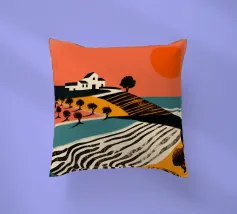 Una scena di spiaggia minimalista è rappresentata con forme geometriche decise e una tavolozza di colori limitata. Una barca a vela è parzialmente visibile dietro una duna di sabbia, mentre il mare tranquillo è affiancato da un fogliame scuro e semplificato.