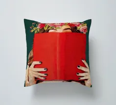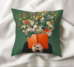 Donna con la mente in fiamme per il fantastico libro che sta leggendo - a proposito di avere una mente aperta! Ragazza retrò, globo terrestre, mela e mazzo di fiori sul tavolo. Vibrazioni da studente universitario vintage. Surreale e divertente collage originale di MsGonzalez.