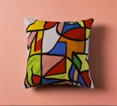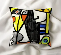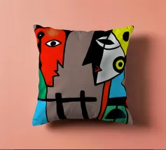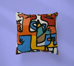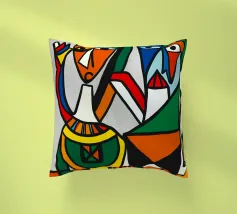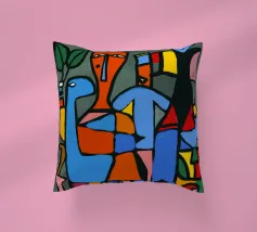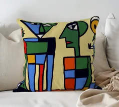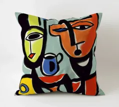 Due figure stilizzate dominano la composizione, caratterizzate da forme astratte e colori vivaci. Una figura appare di profilo mentre l'altra è rivolta in avanti, entrambe con tratti esagerati e una qualità stravagante.