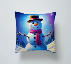 Un pupazzo di neve, con tanto di cappello a cilindro e sciarpa, saluta la sera d'inverno in una foresta serena. I fiocchi di neve cadono delicatamente intorno, creando un'atmosfera magica.
