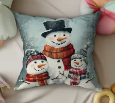 Un pupazzo di neve, con tanto di cappello a cilindro e sciarpa, saluta la sera d'inverno in una foresta serena. I fiocchi di neve cadono delicatamente intorno, creando un'atmosfera magica.