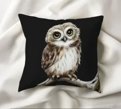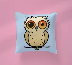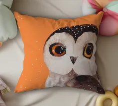Un dipinto a olio di un gufo dall'aspetto simpatico e divertente. Si tratta di un uccello marrone chiaro con grandi occhi arancioni. Gli occhi del gufo sono un po' irregolari, il che lo fa sembrare ancora più buffo e dolce. Sembra anche un po' spaventato con i suoi occhi rotondi.