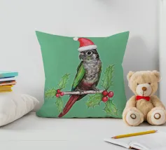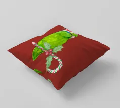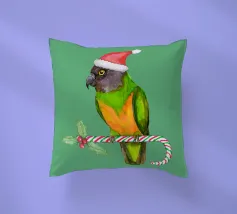 Illustrazione vettoriale digitale di un simpatico cacatua dalla cresta salmonata. Indossa un cappello natalizio e tiene in mano una caramella decorata con agrifoglio. Sembra molto carino.