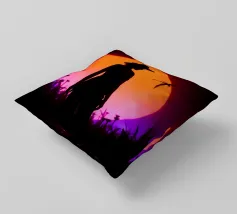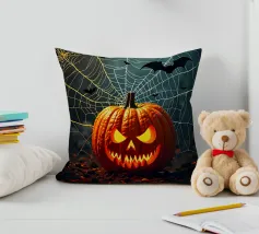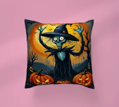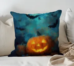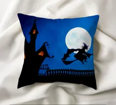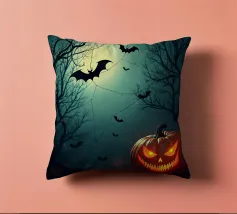 Al calare del crepuscolo, una strega in silhouette vola a cavallo della sua scopa tra i pipistrelli, con una zucca incandescente in primo piano, creando un'atmosfera incantevole.