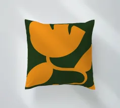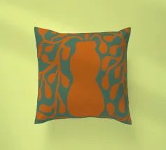 Un vaso stilizzato dalle forme astratte e fluide si estende verso l'esterno, ricordando forme vegetali. Il colore arancione vibrante contrasta con lo sfondo verde tenue, creando un effetto visivo dinamico.
