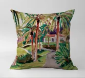 Una villa bianca e immacolata con il tetto di tegole rosse è incastonata tra palme maestose, un vialetto curvo conduce l'occhio in questo sereno e lussuoso ambiente tropicale o mediterraneo.