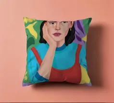 Un suggestivo ritratto astratto di un volto di donna, diviso in due metà, una nera e una bianca, con labbra rosse e capelli fluenti su un caldo sfondo arancione.