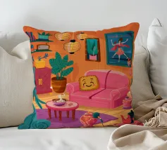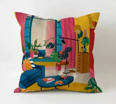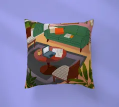 Un'illustrazione vivace di un soggiorno eclettico e massimalista con mobili colorati, una parete a galleria, numerose piante d'appartamento e un tappeto viola.